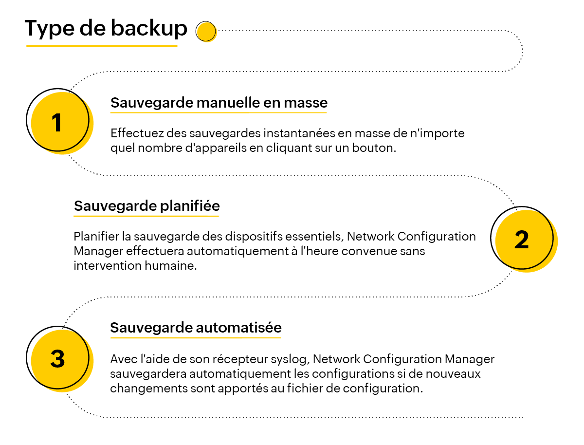 Network Configuration Manager étant votre outil de sauvegarde réseau tout-en-un, vous disposez de trois options proactives pour gérer les sauvegardes de configuration de votre réseau :