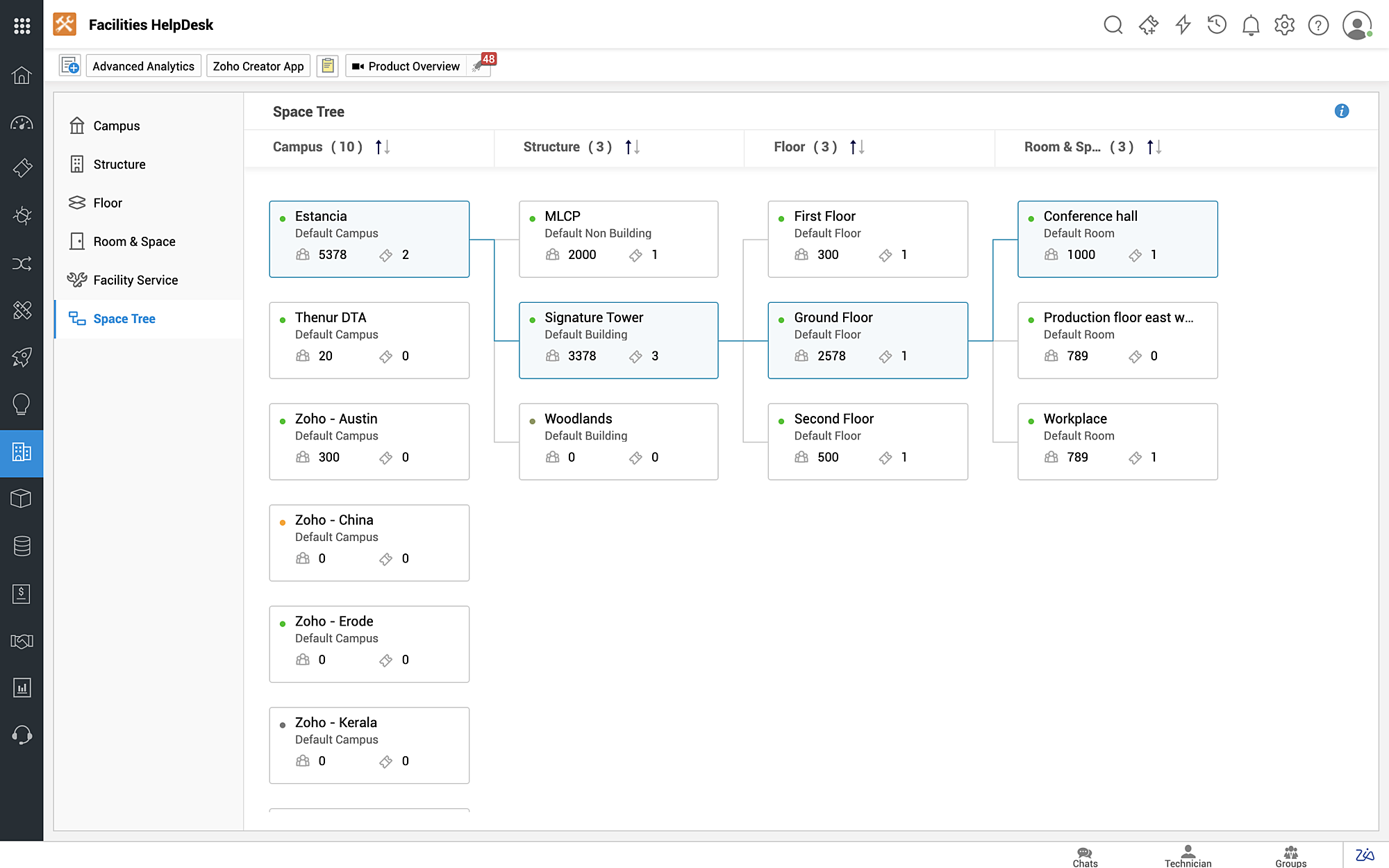 Les gestionnaires d'installations peuvent suivre numériquement tous les niveaux de l'arborescence des espaces, des campus étendus sur plusieurs sites aux pièces spécifiques et aux espaces ouverts.