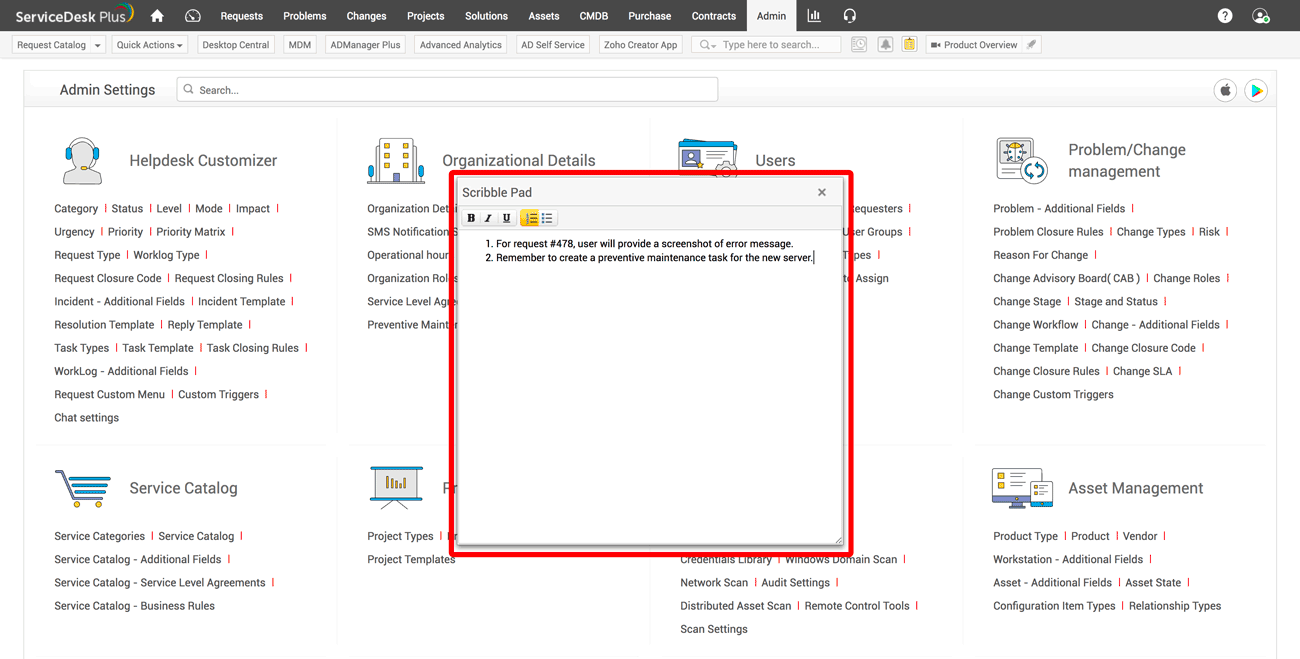 La prise de notes est plus simple avec le nouveau ServiceDesk Plus. Vous avez besoin de noter rapidement des informations importantes d'un utilisateur final ou d'un ticket ? Pas de problème ! Il suffit d'ouvrir le Scribble Pad depuis la page d'accueil. Toutes vos notes sont automatiquement sauvegardées.Amélioration de l'éditeur HTML