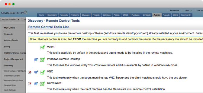 Contrôle à distance intégré dans ServiceDesk Plus MSP :